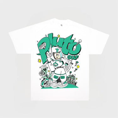 Introducing the Pluto Golf "anniversary tee". Hand-drawn by world-renowned artist Freako Rico, this graphic t-shirt commemorates our 1 year anniversary.